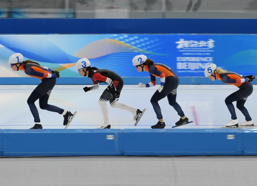 Yang Binyu (2nd L) of China, Sophie Kraaijeveld (1st R), Isabel Grevelt (2nd R), Leonie Bats of the Netherlands compete during the women's mass start competition at the Speed Skating China Open in Beijing, China, on Oct. 10, 2021. (Xinhua/Zhang Chenlin)