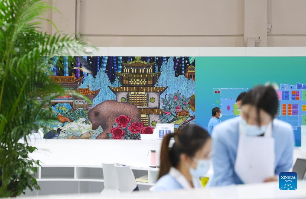 Volunteers work at the media center of the 15th meeting of the Conference of the Parties to the Convention on Biological Diversity, known as COP15, in Kunming, southwest China's Yunnan Province, Oct. 12, 2021. COP15 kicked off in Kunming on Oct. 11. (Xinhua/Wang Nan)