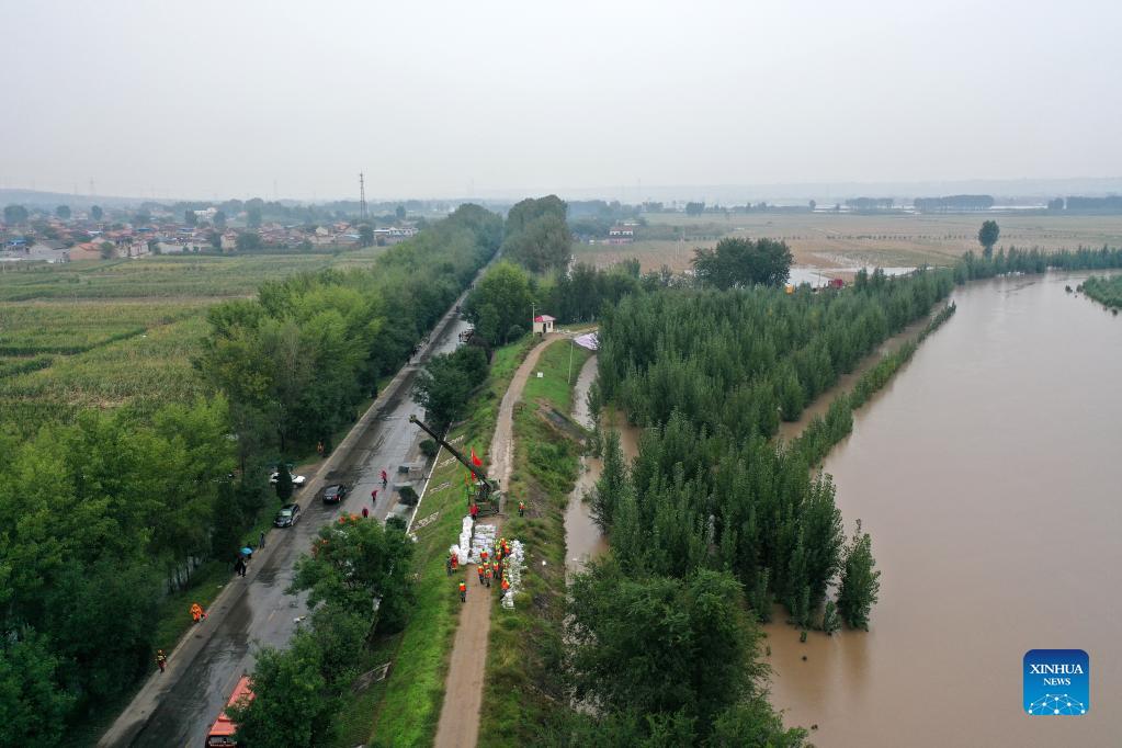 Aerial photo taken on Oct. 11, 2021 shows rescuers reinforcing dyke of the Fenhe River, a tributary of the Yellow River, in Jishan County, north China's Shanxi Province. A dyke crack with a length of more than 10 meters was closed in a section of the Fenhe River in Jishan on Monday. (Xinhua/Zhan Yan)