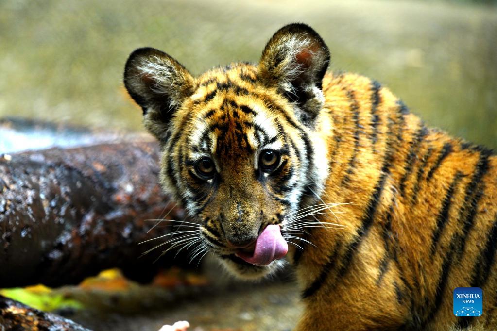 Photo taken on Oct. 11, 2021 shows a South China tiger at the Shanghai Zoo in east China's Shanghai. The South China tiger is a rare kind endemic to China and is on the national first-class protection list. Currently, a total of 28 South China tigers are living in the Shanghai Zoo. The zoo has recorded each tiger's information and established a gene bank for research, and tigers are treated and bred in a scientific way. (Xinhua/Zhang Jiansong)