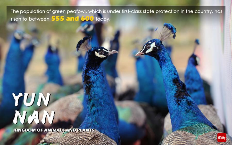 The population of green peafowl, which is under first-class state protection in the country, has risen to between 555 and 600 today.
