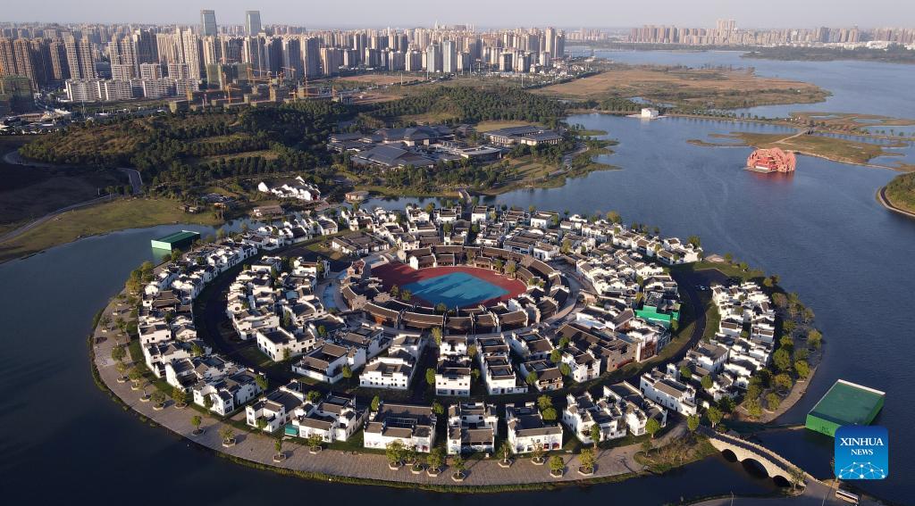 Aerial photo taken on Oct. 12, 2021 shows a view of the hosting facility of the Taihu World Cultural Forum in Bengbu, east China's Anhui Province. The sixth annual conference of the Taihu World Cultural Forum kicked off here Tuesday. (Xinhua/Zhou Mu)