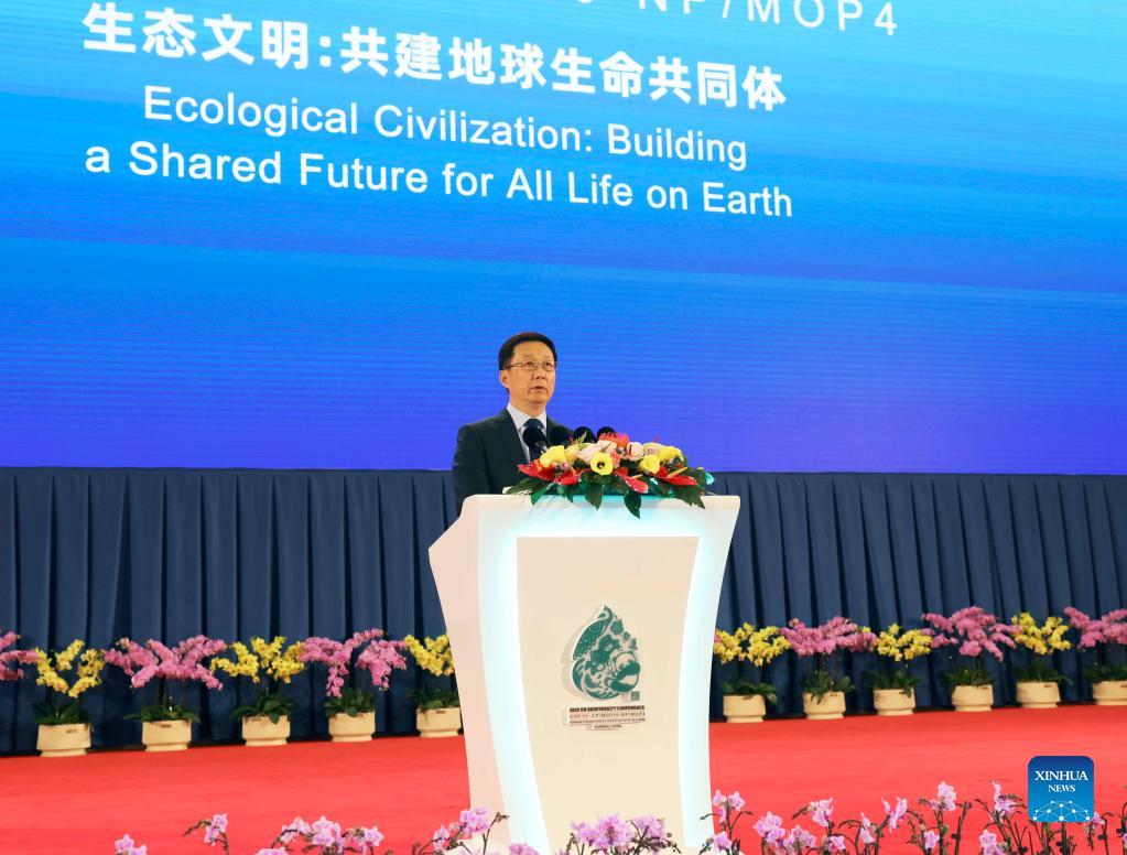 Chinese Vice Premier Han Zheng, also a member of the Standing Committee of the Political Bureau of the Communist Party of China Central Committee, addresses the leaders' summit of the 15th meeting of the Conference of the Parties to the Convention on Biological Diversity, known as COP15, in Kunming, southwest China's Yunnan Province, Oct. 12, 2021. (Xinhua/Liu Weibing)