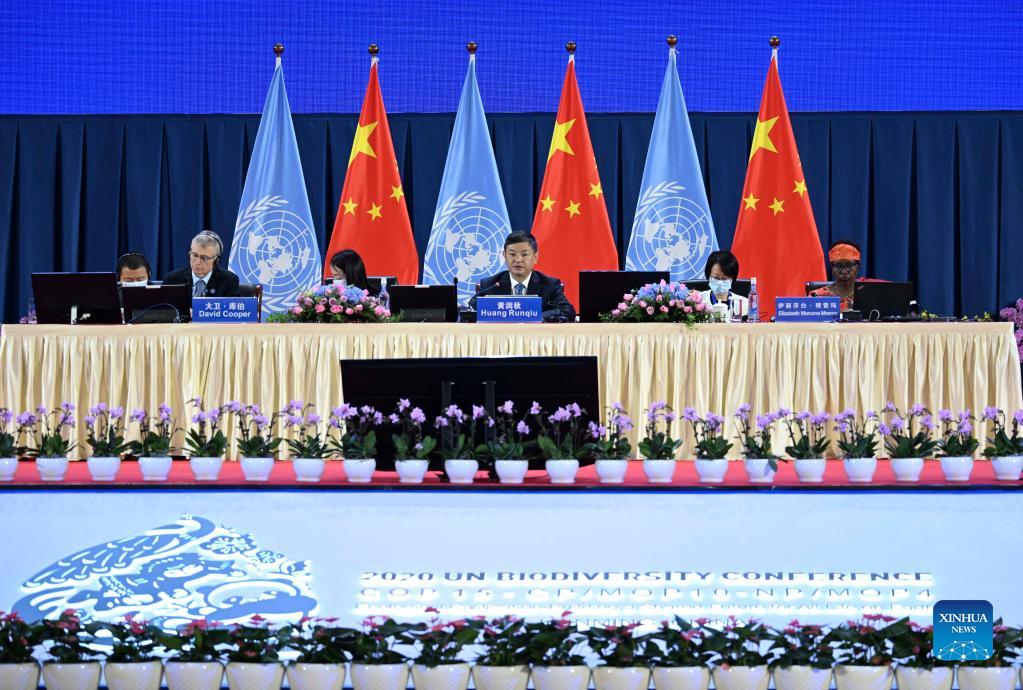 Chinese Minister of Ecology and Environment Huang Runqiu (3rd R) presides over the ministerial plenary meeting of the 15th meeting of the Conference of the Parties to the Convention on Biological Diversity, or COP15, in Kunming, southwest China's Yunnan Province, Oct. 12, 2021. (Xinhua/Chen Yehua)