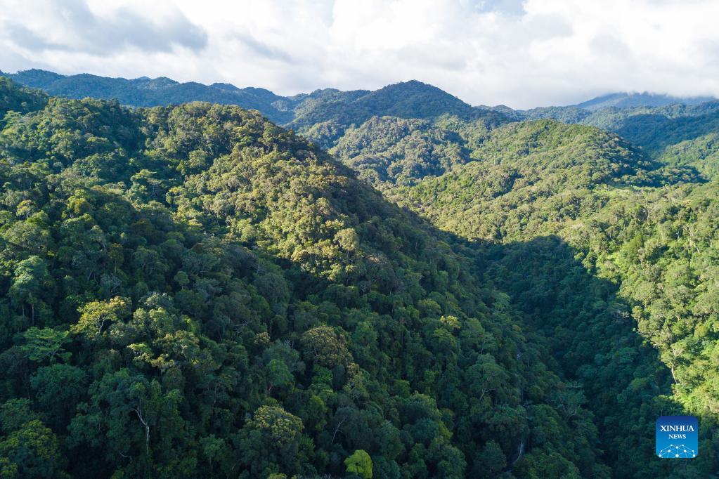 Aerial photo taken on Sept. 26, 2021 shows the view of the Hainan Tropical Rainforest National Park in south China's Hainan Province. The Hainan Tropical Rainforest National Park in south China's Hainan Province boasts one of the most concentrated, best preserved and largest contiguous tropical rainforests in China. The park covers nine cities and counties, with a total area of 4,400 square km, or about one-seventh of Hainan Island's land area. It is an important part of the world's tropical rainforest and a key area for biodiversity conservation in China. (Xinhua/Pu Xiaoxu)
