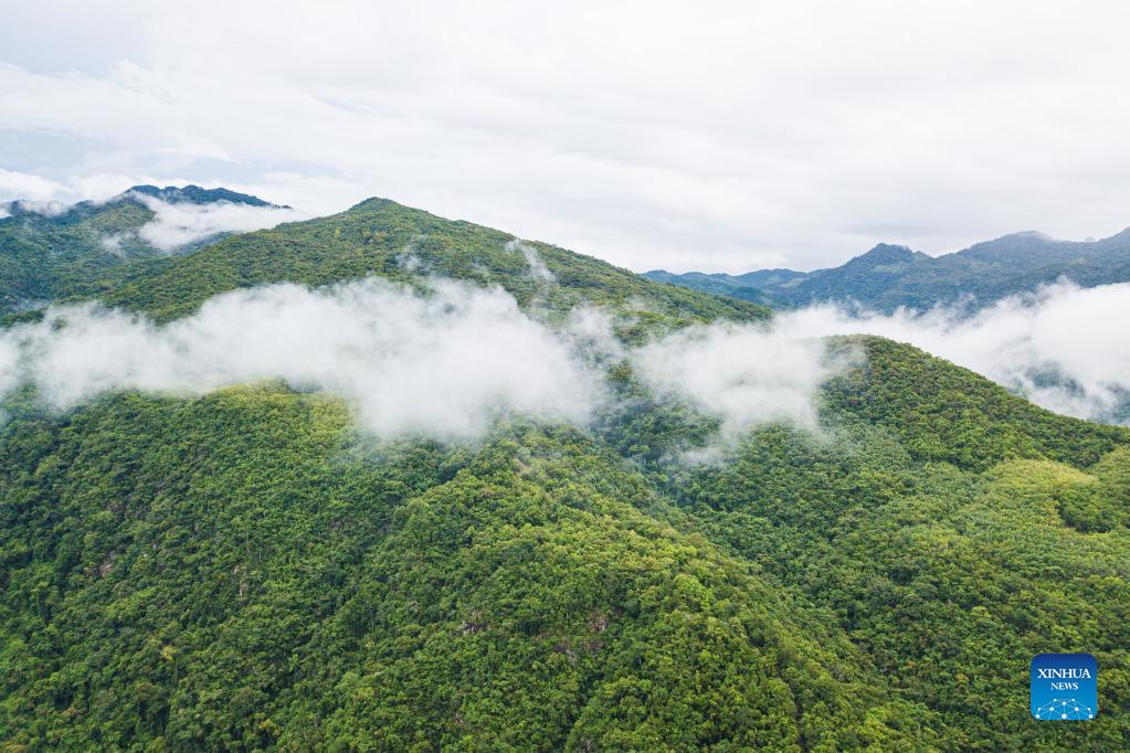 Aerial photo taken on Sept. 27, 2021 shows the view of the Hainan Tropical Rainforest National Park in south China's Hainan Province. The Hainan Tropical Rainforest National Park in south China's Hainan Province boasts one of the most concentrated, best preserved and largest contiguous tropical rainforests in China. The park covers nine cities and counties, with a total area of 4,400 square km, or about one-seventh of Hainan Island's land area. It is an important part of the world's tropical rainforest and a key area for biodiversity conservation in China. (Xinhua/Pu Xiaoxu)