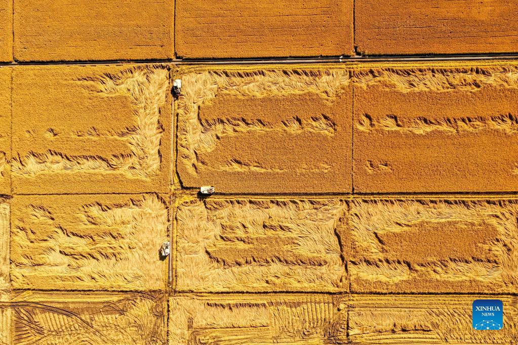 Aerial photo taken on Oct. 12, 2021 shows farmers operating rice harvesters in Wanchang Town of Yongji County in Jilin City, northeast China's Jilin Province. (Xinhua/Zhang Nan)