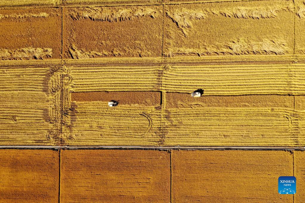 Aerial photo taken on Oct. 12, 2021 shows farmers operating rice harvesters in Wanchang Town of Yongji County in Jilin City, northeast China's Jilin Province. (Xinhua/Zhang Nan)