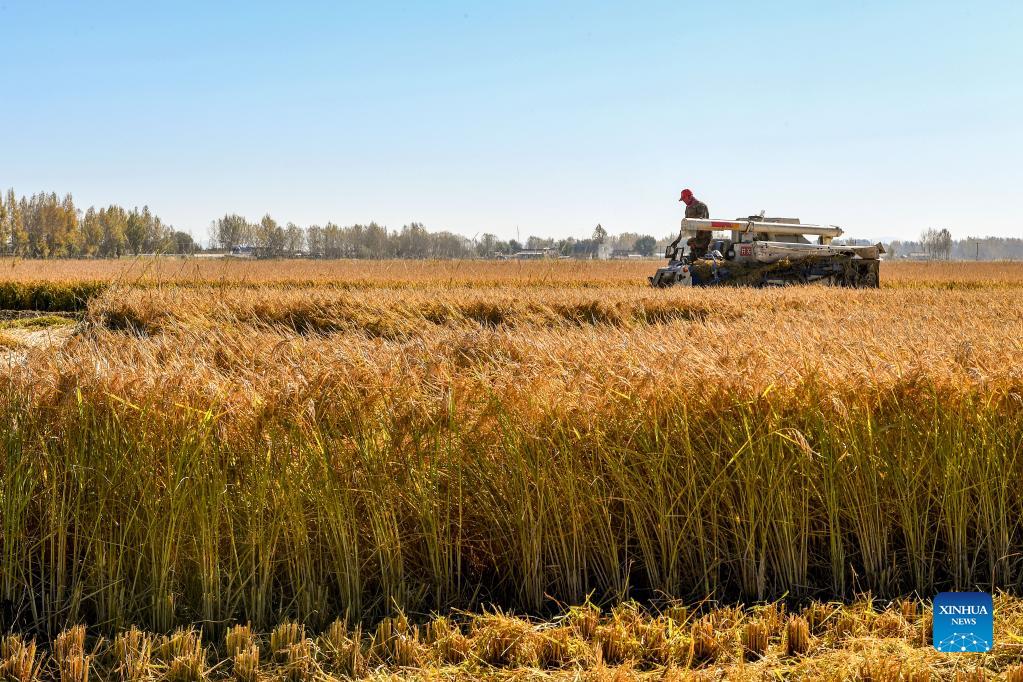 Photo taken on Oct. 12, 2021 shows a farmer operating a rice harvester in Wanchang Town of Yongji County in Jilin City, northeast China's Jilin Province. (Xinhua/Zhang Nan)