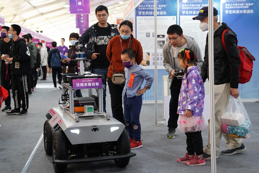 Visitors view an exhibit at an academic science and technology exhibition in Tsinghua University in Beijing, April 25, 2021. (Xinhua/Ju Huanzong)