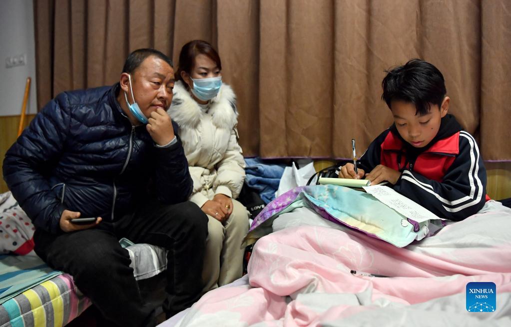 Parents look on as their child does homework at a temporary relocation site in Dali County of Weinan City, northwest China's Shaanxi Province, Oct. 11, 2021. Nearly 240,000 people were affected by the floods due to continuous downpours in Dali County of Shaanxi Province. So far, more than 25,000 people have been evacuated to temporary relocation sites offering accommodation and medical services. (Xinhua/Liu Xiao)
