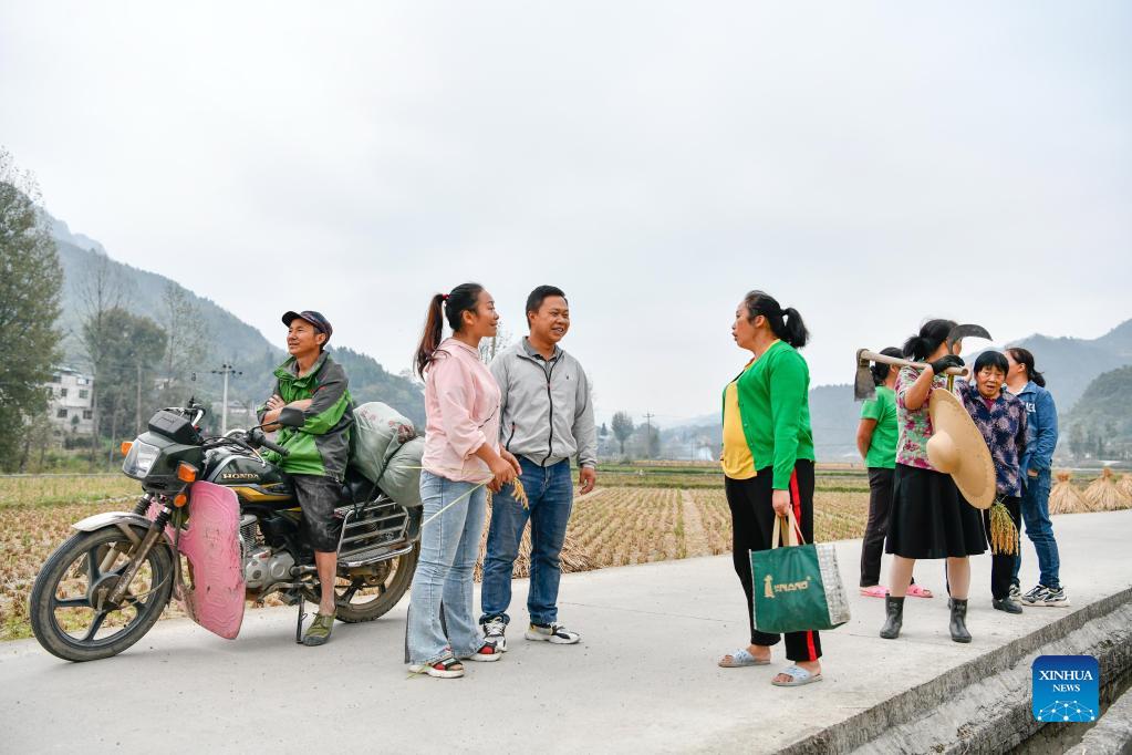 Zhao Xiangrong (3rd L) and his wife (2nd L) talk to villagers in Leping Village of Majiang County, southwest China's Guizhou Province, Oct. 8, 2021. Zhao Xiangrong, a former truck driver and a chef, returned to his hometown in Guizhou and started planting rice in 2015. Supported and guided by local government and experts, Zhao has developed skills in cultivating rice containing zinc, selenium and other microelement. After six years of hard work, Zhao has accumulated rich experience in sowing seeds, managing field, as well as processing, transportation and storage of rice. The rice planting area of Zhao Xiangrong reached nearly 300 mu (20 hectares) this year, and his high-quality rice has gained great reputation in many provinces of China. Zhao has vigorously shared his experience with fellow villagers and is willing to make further contribution to the development of local rice industry and rural revitalization. (Xinhua/Yang Wenbin)