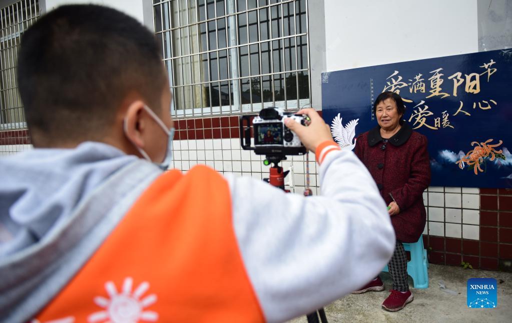 (211013) -- NEIJIANG, Oct. 13, 2021 (Xinhua) -- A volunteer takes a picture for an elderly woman in Yuhuangguan Village of Neijiang City, southwest China's Sichuan Province, Oct. 12, 2021. The Double Ninth Festival or the Chongyang Festival is approaching. A series of celebration activities were held across the country. (Photo by Tang Mingrun/Xinhua)