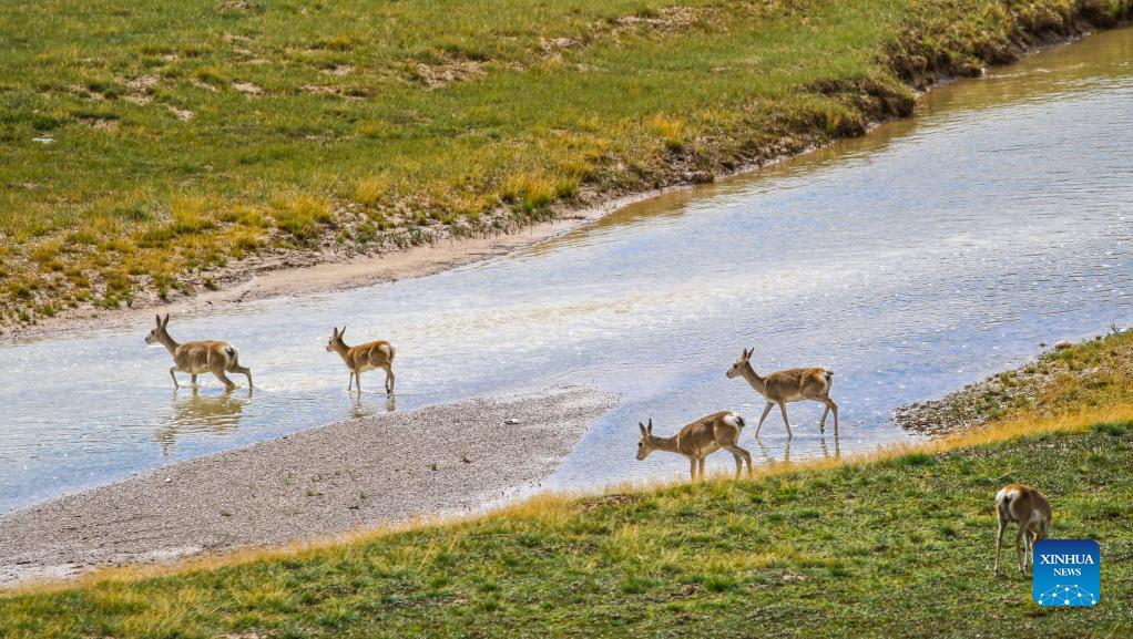 A herd of Tibetan antelopes are seen at the source of the Yellow River section of the Sanjiangyuan National Park in northwest China's Qinghai Province, Aug. 26, 2016. Sanjiangyuan, meaning the "source of three rivers," is home to the headwaters of the Yangtze, Yellow and Lancang rivers. The ecological system has been steadily improving in recent years in the Sanjiangyuan National Park, making it a habitat of an increasing number of wild animals. (Photo by Song Zhongyong/Xinhua)