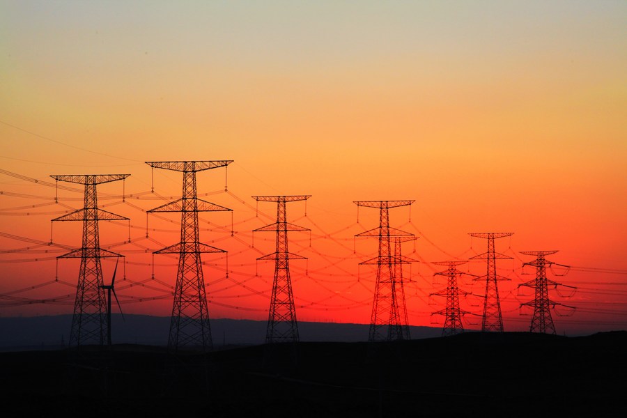 File photo shows facilities of the Yindong ±660kV high-voltage direct current (HVDC) transmission project at sunset in northwest China's Ningxia Hui Autonomous Region. (Xinhua)
