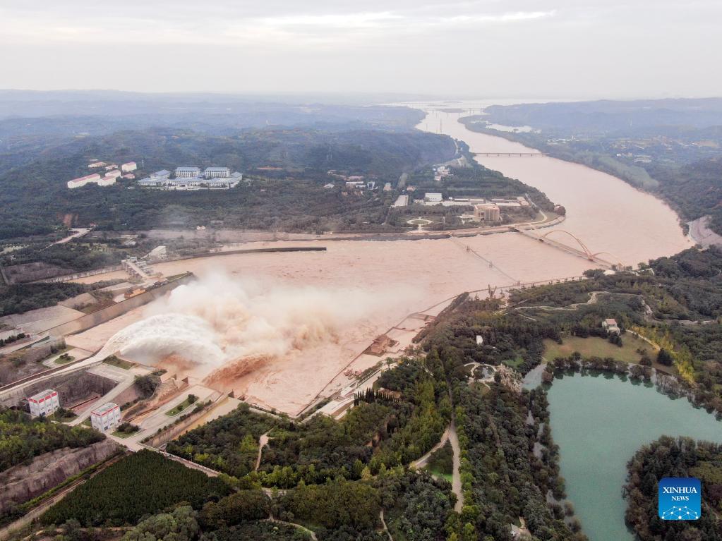 Aerial photo taken on Oct. 12, 2021 shows water gushing out from sluiceways of the Xiaolangdi Reservoir on the Yellow River in central China's Henan Province. Due to continuous rainfall, the Yellow River has seen three floods since Sept. 27. The water level of the Xiaolangdi Reservoir on Oct. 9 reached a record high of 273.5 meters since the dam was built. (Xinhua/Jiang Liang)