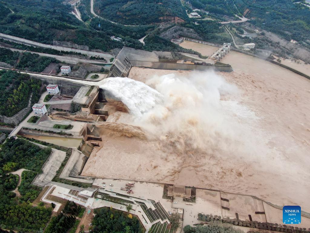 Aerial photo taken on Oct. 12, 2021 shows water gushing out from sluiceways of the Xiaolangdi Reservoir on the Yellow River in central China's Henan Province. Due to continuous rainfall, the Yellow River has seen three floods since Sept. 27. The water level of the Xiaolangdi Reservoir on Oct. 9 reached a record high of 273.5 meters since the dam was built. (Xinhua/Jiang Liang)