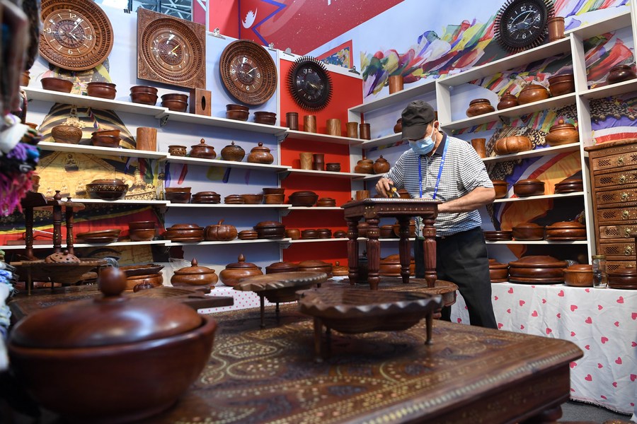 An exhibitor from Nepal fixes a piece of furniture during the 18th China-ASEAN Expo in Nanning, capital of south China's Guangxi Zhuang Autonomous Region, Sept. 11, 2021.(Xinhua/Ma Ning)