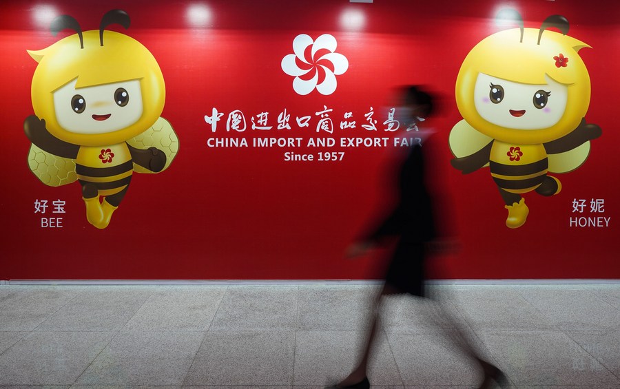 A staff member walks past a poster on "Bee" and "Honey", mascots of the 130th session of the China Import and Export Fair, in south China's Guangdong Province, Oct. 9, 2021. (Xinhua/Liu Dawei)