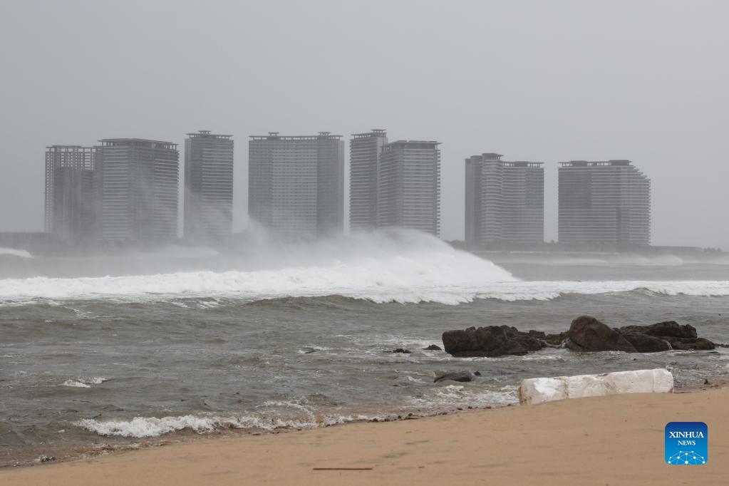 Huge waves hit coast in Wanning city, south China's Hainan Province, Oct. 13, 2021. Typhoon Kompasu, the 18th typhoon of this year, made landfall in south China's island province of Hainan on Wednesday afternoon. (Xinhua/Zhang Liyun)