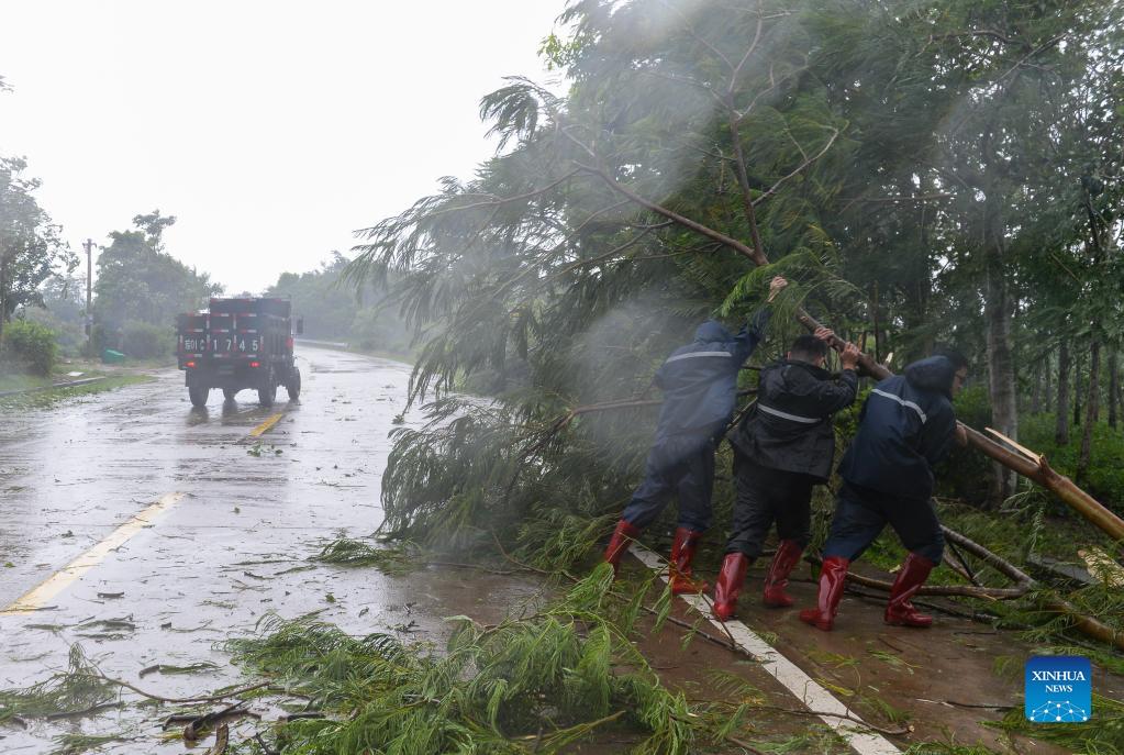Workers clean up fallen trees destroyed by typhoon Kompasu in Shangen Township of Wanning city, south China's Hainan Province, Oct. 13, 2021. Typhoon Kompasu, the 18th typhoon of this year, made landfall in south China's island province of Hainan on Wednesday afternoon. (Xinhua/Zhou Jiayi)
