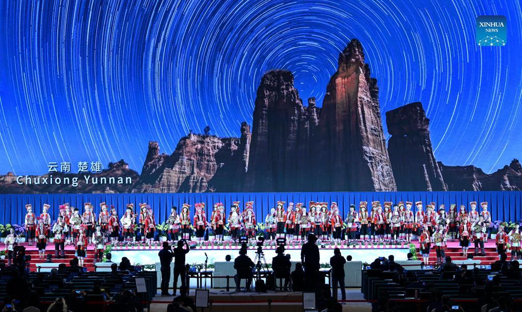 A performance is held at the opening ceremony of the Ecological Civilization Forum of the first part of the 15th meeting of the Conference of the Parties to the Convention on Biological Diversity (COP15) in Kunming, southwest China's Yunnan Province, on Oct. 14, 2021. (Xinhua/Chen Yehua)