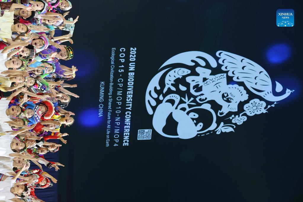 A performance is held at the opening ceremony of the Ecological Civilization Forum of the first part of the 15th meeting of the Conference of the Parties to the Convention on Biological Diversity (COP15) in Kunming, southwest China's Yunnan Province, on Oct. 14, 2021. (Xinhua/Jin Liwang)