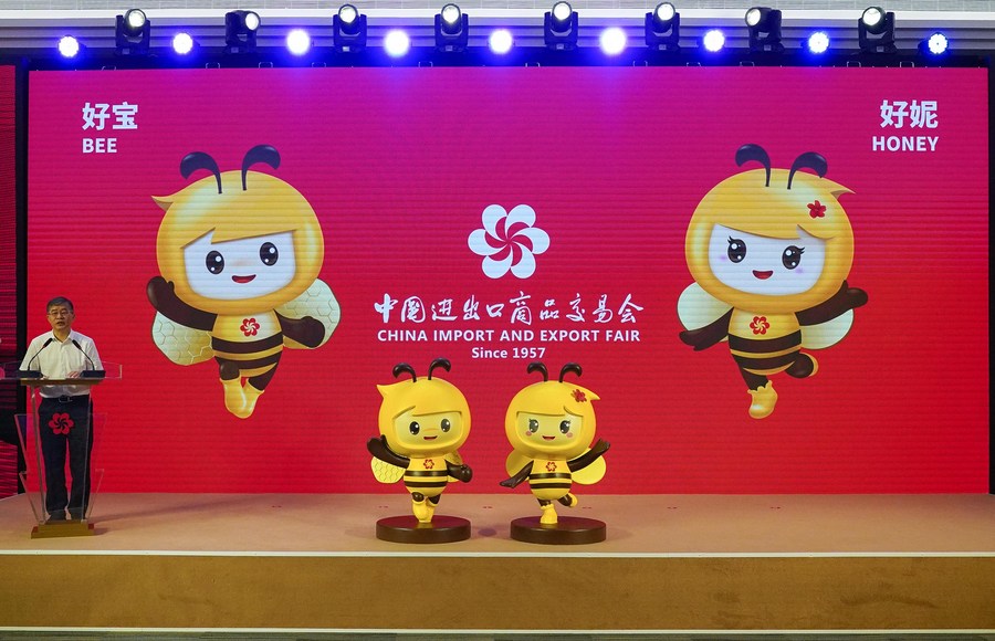 Photo taken on Oct. 9, 2021 shows "Bee" and "Honey", mascots of the 130th session of the China Import and Export Fair, during a press conference in south China's Guangdong Province. (Xinhua/Liu Dawei)