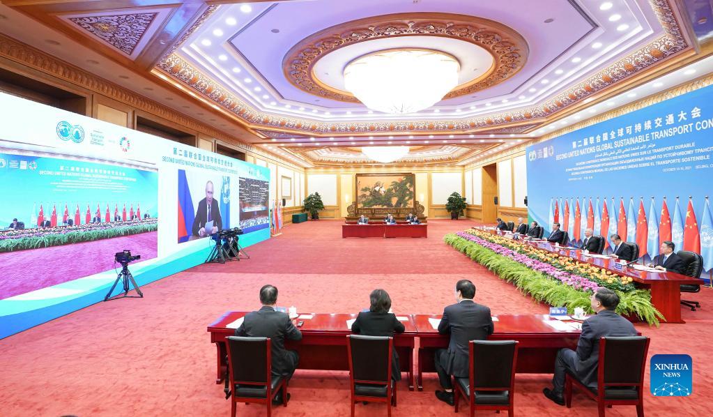 Chinese President Xi Jinping delivers a keynote speech via video link at the opening ceremony of the Second United Nations Global Sustainable Transport Conference, Oct. 14, 2021. (Xinhua/Yin Bogu)