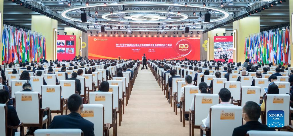 Photo taken on Oct. 14, 2021 shows the opening ceremony of the 130th session of the China Import and Export Fair in Guangzhou, capital of south China's Guangdong Province. The fair, which is also known as the Canton Fair, opened on Thursday in Guangzhou. (Xinhua/Zhai Jianlan)