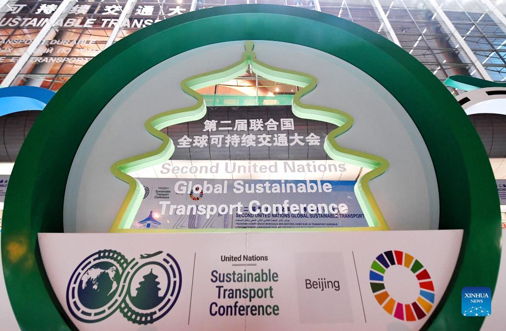Photo taken on Oct. 14, 2021 shows the logo of the Second United Nations Global Sustainable Transport Conference in Beijing, capital of China. The Second United Nations Global Sustainable Transport Conference kicked off on Thursday in Beijing. The three-day conference will be held both online and offline. (Xinhua/Li He)