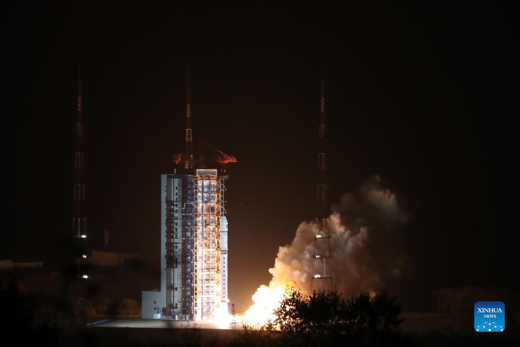 A Long March-2D rocket carrying China's first solar exploration satellite blasts off from the Taiyuan Satellite Launch Center in north China's Shanxi Province, Oct. 14, 2021. China sent its first solar exploration satellite into space from the Taiyuan Satellite Launch Center in north China's Shanxi Province at 6:51 p.m. Thursday (Beijing Time). The satellite was launched aboard a Long March-2D rocket and entered its planned orbit successfully. Ten small satellites including an orbital atmospheric density detection experimental satellite and a commercial meteorological detection constellation experimental satellite were also sent into space using the same carrier rocket. It was the 391st flight mission of the Long March carrier rocket series. (Photo by Zheng Bin/Xinhua)