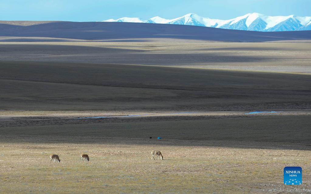 Tibetan antelopes are seen at Hol Xil area of the Sanjiangyuan National Park in northwest China's Qinghai Province, Sept. 28, 2021. Sanjiangyuan, meaning the "source of three rivers," is home to the headwaters of the Yangtze, Yellow and Lancang rivers. The ecological system has been steadily improving in recent years in the Sanjiangyuan National Park, making it a habitat of an increasing number of wild animals. (Xinhua/Xue Yubin)