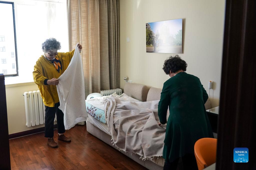 Li Zhanping (L) cleans the room with a housekeeper at an apartment of Yanda Golden Age Health Nursing Center in north China's Hebei Province, Oct. 11, 2021. In recent years, many senior people in Beijing choose to spend their elderly life at nursing houses in other surrounding cities. Three years ago, the 80-year-old Beijinger Lyu Weiye, together with his wife Li Zhanping, decided to rest their remaining years at a nursing institution in Hebei Province, which is located only 30 kilometers away from Beijing. Now they live a very comfortable life between the two cities, enjoying the medical services at the nursing institution as well as gathering with their old friends in Beijing. (Xinhua/Peng Ziyang)