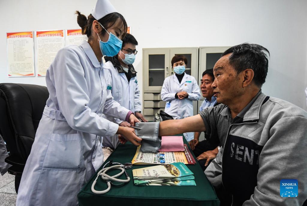 Medical workers provide free medical care service to the elders at a university for senior citizens of Zhongshan District in Liupanshui, southwest China's Guizhou Province, Oct. 14, 2021. Various activities are carried out in the district to celebrate the Double Ninth Festival or the Chongyang Festival for the elders. The festival, celebrated throughout China on the ninth day of the ninth month on the Chinese lunar calendar, is an occasion to care for and send blessings to the elderly. (Xinhua/Tao Liang)