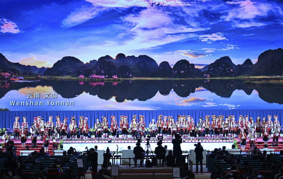 A performance is held at the opening ceremony of the Ecological Civilization Forum of the first part of the 15th meeting of the Conference of the Parties to the Convention on Biological Diversity (COP15) in Kunming, southwest China's Yunnan Province, Oct. 14, 2021. (Xinhua/Chen Yehua)