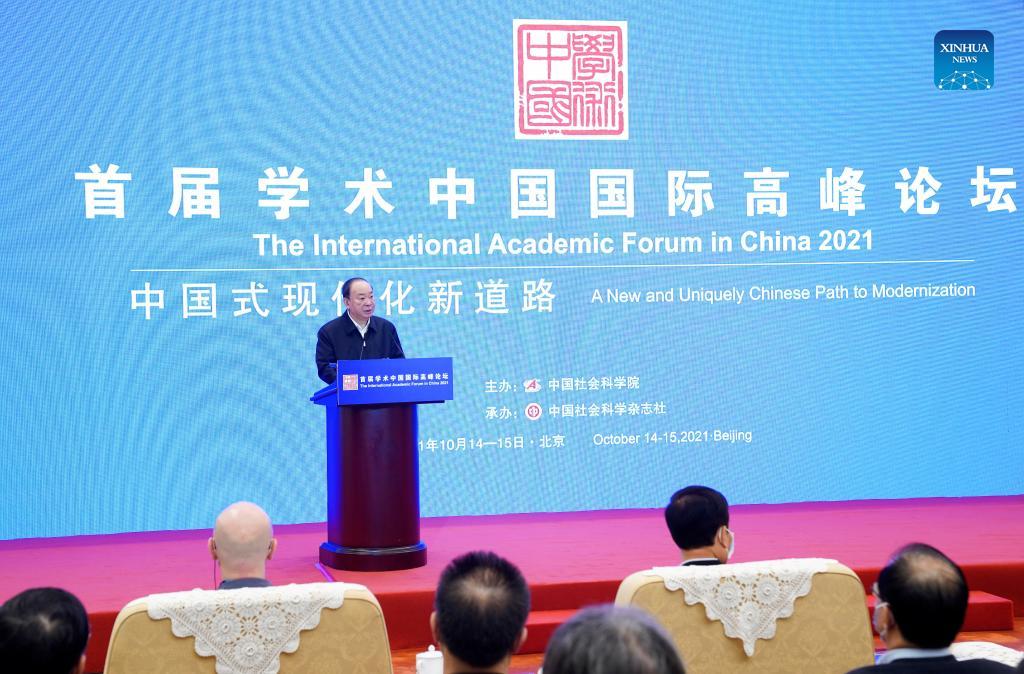 Huang Kunming, a member of the Political Bureau of the Communist Party of China (CPC) Central Committee and head of the Publicity Department of the CPC Central Committee, delivers a speech at the opening ceremony of the International Academic Forum in China 2021 in Beijing, capital of China, Oct. 14, 2021. (Xinhua/Zhang Ling)