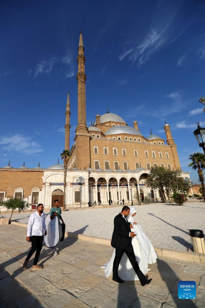 People take wedding photos in the Saladin Citadel in Cairo, Egypt, on Oct. 14, 2021. The Saladin Citadel, built by Saladin (1138-1193) in the 12th century, is an attraction for tourists in Cairo. (Xinhua/Sui Xiankai)