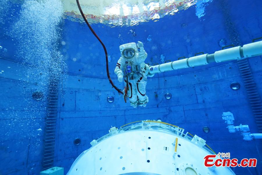 Chinese astronaut Zhai Zhigang moves on a robotic arm during an underwater training, Aug. 25, 2021. (Photo/Kong Fangzhou)