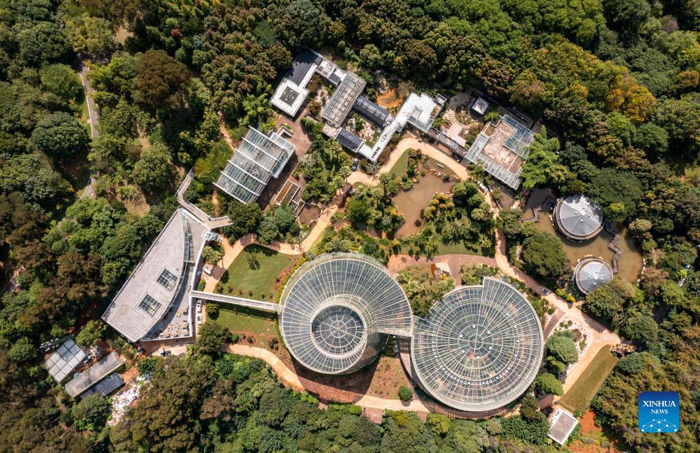 Aerial photo taken on Sept. 26, 2021 shows the view of the Fuligong Greenhouses at Kunming Botanical Garden in Kunming, southwest China's Yunnan Province. (Xinhua/Jiang Wenyao)