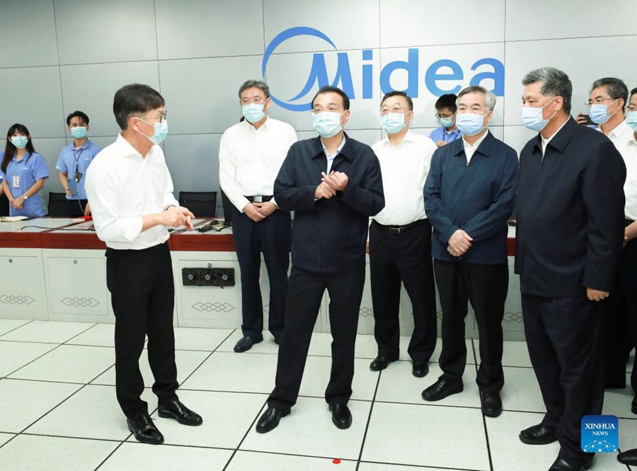 Chinese Premier Li Keqiang, also a member of the Standing Committee of the Political Bureau of the Communist Party of China (CPC) Central Committee, visits Midea Group Co., Ltd. in Foshan, south China's Guangdong Province, Oct. 14, 2021. Li made an inspection tour in Guangdong Province from Wednesday to Friday. (Xinhua/Pang Xinglei)