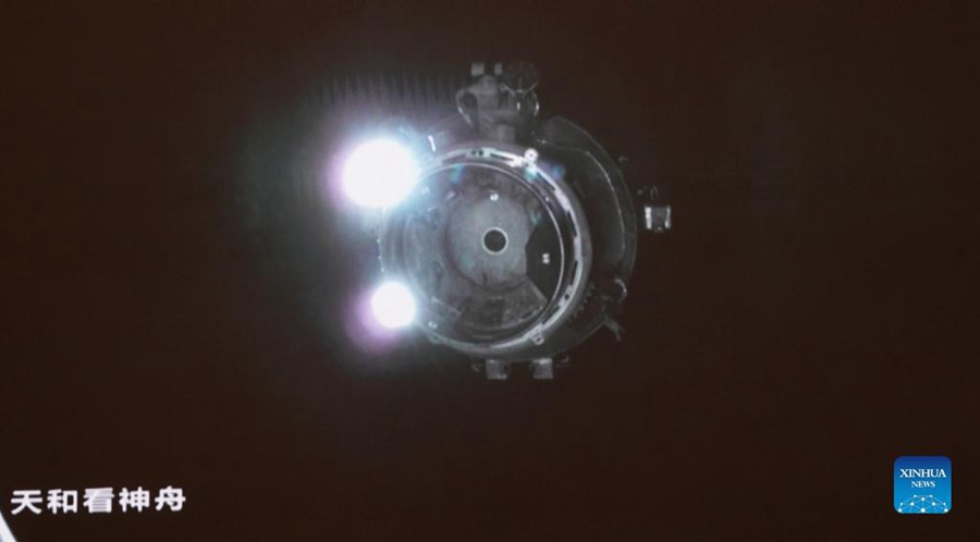 Screen image captured at Beijing Aerospace Control Center in Beijing, capital of China, Oct. 16, 2021 shows China's Shenzhou-13 crewed spaceship docking with the radial port of the space station core module Tianhe. China's Shenzhou-13 crewed spaceship successfully docked with the radial port of the space station core module Tianhe on Saturday, according to the China Manned Space Agency. (Xinhua/Tian Dingyu)