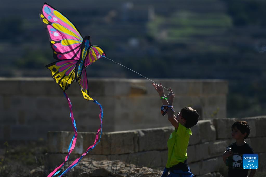 A boy flies a kite during the 4th edition of the International Kite and Wind Festival in the village of Gharb on the island of Gozo, Malta, on Oct. 17, 2021. (Xinhua/Jonathan Borg)