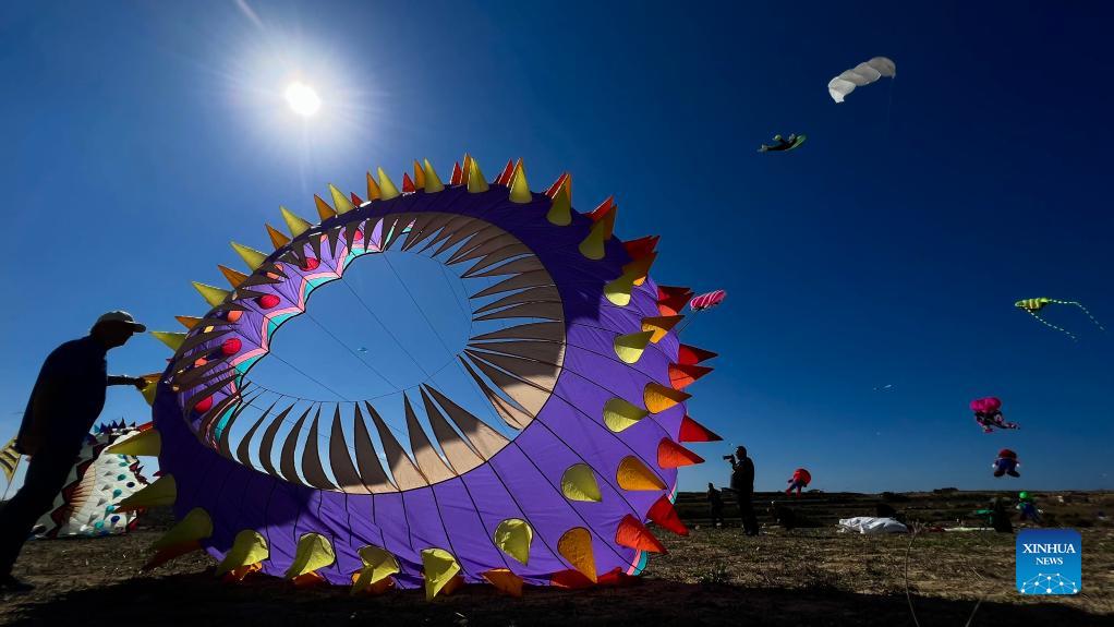 A man prepares to fly a kite during the 4th edition of the International Kite and Wind Festival in the village of Gharb on the island of Gozo, Malta, on Oct. 17, 2021. (Xinhua/Jonathan Borg)