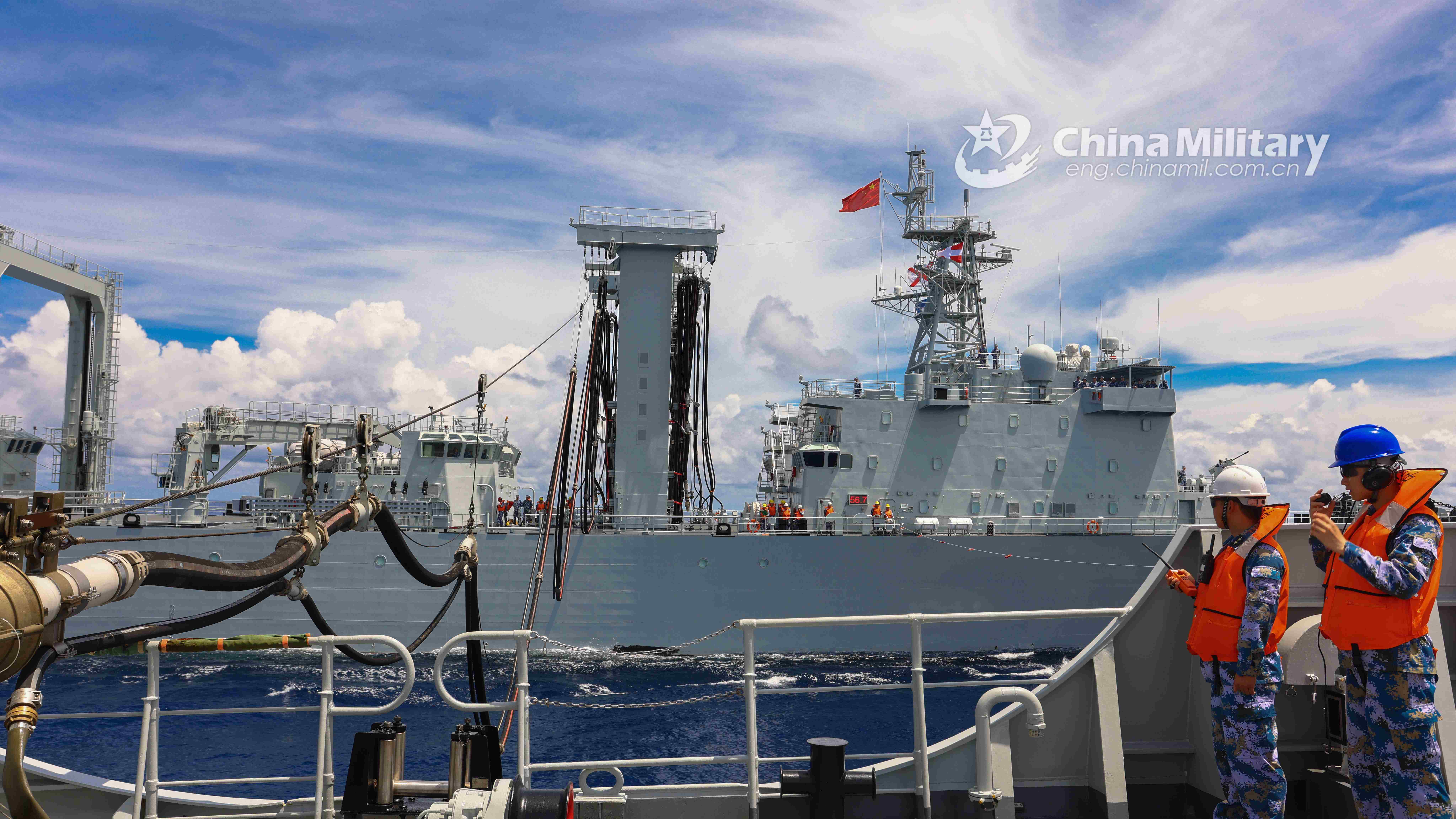 Sailors assigned to the 39th Chinese naval escort taskforce connect a fuel probe from the comprehensive supply ship Taihu (Hull 889) to their ship during a replenishment-at-sea operation in waters of the South China Sea on October 1, 2021. The 39th Chinese naval escort taskforce is composed of the guided-missile destroyer Urumqi (Hull 118), guided-missile frigate Yantai (Hull 538), and comprehensive supply ship Taihu (Hull 889), together with two shipborne helicopters and dozens of special operations soldiers. It is the first time for Destroyer Urumqi to carry out the escort mission. (eng.chinamil.com.cn/Photo by Zhao Yang)