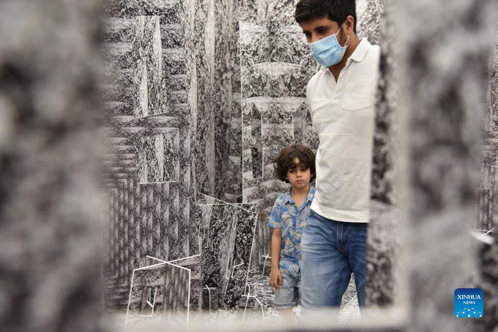 People visit the BIENALSUR exhibition in JAX, Diriyah, Riyadh, Saudi Arabia, on Oct. 16, 2021. The exhibition opened for public on Saturday in Diriyah under the title "Echoes: A World Between Analogue &Virtual". (Xinhua/Wang Haizhou)