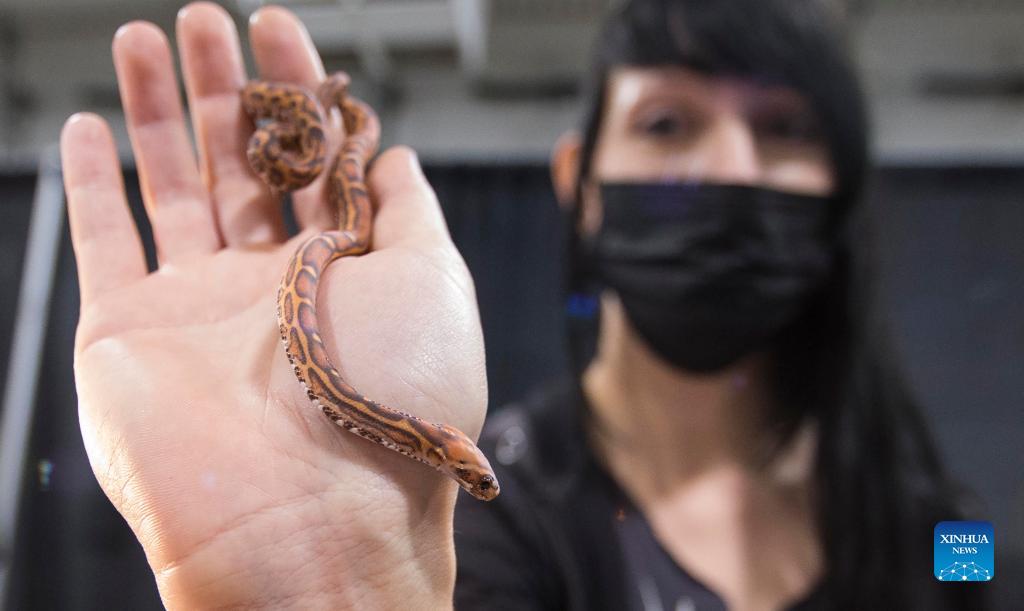 A woman shows a 4-month old corn snake during the 2021 Toronto Reptile Expo at the International Center in Mississauga, the Greater Toronto Area, Canada, on Oct. 17, 2021. Kicking off on Sunday, this event provided an opportunity to view species of reptilian specialty pets from across Canada. (Photo by Zou Zheng/Xinhua)