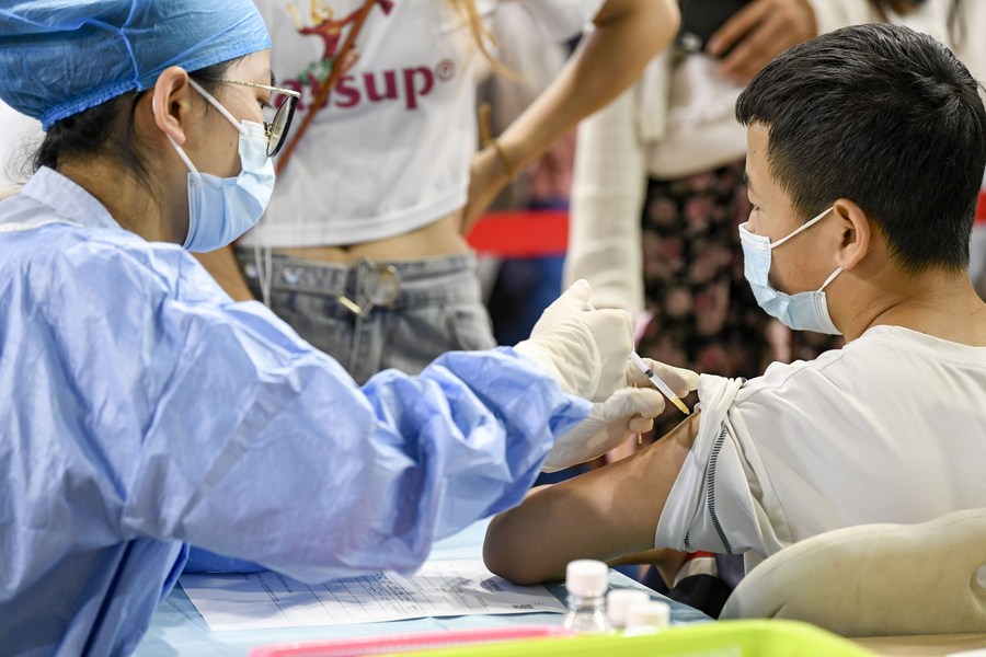 A student receives a dose of COVID-19 vaccine at a vaccination site in Yinchuan, capital city of northwest China's Ningxia Hui Autonomous Region, Aug. 18, 2021. (Xinhua/Feng Kaihua)