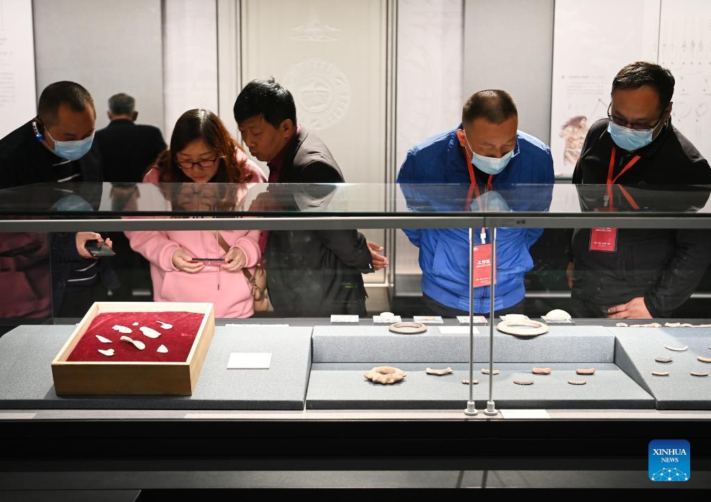 Visitors watch exhibits at the Yangshao Culture museum of the Yangshao Village national archaeological park in Mianchi County, central China's Henan Province, Oct. 17, 2021. The park officially opened to public here on Sunday. In 1921, the first excavation on the Yangshao Village site, which is in Mianchi County, Henan Province, marked the birth of Chinese archaeology. The name of China's first-known archaeological culture, the Yangshao Culture, was also derived from the site. In 1951 and 1980, China launched the second and third excavation of the ruins. Originating around the middle reaches of the Yellow River, the Yangshao Culture is considered an important stream of Chinese civilization, and is widely known for its advanced pottery-making technology. The fourth archaeological excavation of the Yangshao Village site began on Aug. 22, 2020, and is still in progress. (Xinhua/Li He)