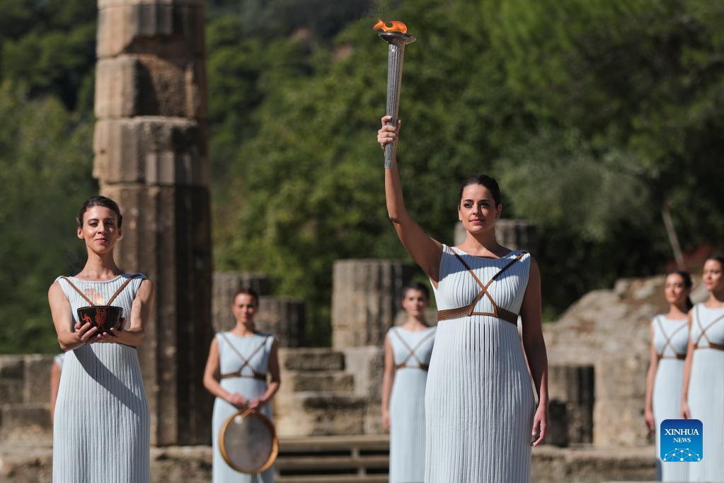 Greek actress Xanthi Georgiou, playing the role of an ancient Greek High Priestess, presents the torch during the Olympic flame lighting ceremony for the Beijing 2022 Winter Olympic Games, in ancient Olympia, Greece, Oct. 18, 2021. (Xinhua/Zheng Huansong)